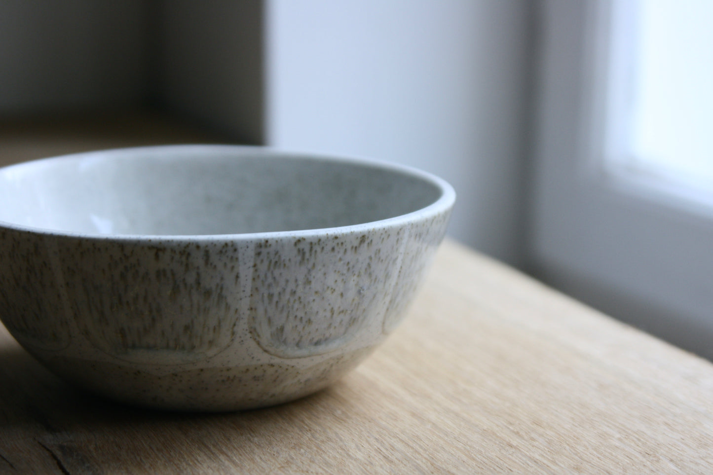 Skålen er velegnet som morgenmads-skål eller til servering småretter eller snacks. Den er støbt i lys stentøj med grå jern-prikker. Efter den første brænding er skålen glaseret på indersiden med en transparent glasur og efterfølgende håndmalet med krystalglasur på ydersiden. Glasurdekorationen fremhæver jern-prikkerne og får dem til at smelte ud i brændingen. I det at jernprikkerne smelter udvikler de sig fra at være grå til at blive gråbrune. Samtidig skabes der en fin kontrast mellem det matte porcelæn og den blanke glasur.