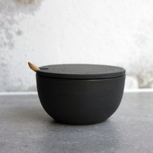 Denne skål med låg er velegnet som enten sukker eller saltskål. Både Skål og låg er lavet i sort stentøj. Indersiden af skålen er glaseret med krystalglasur og de uglaserede flader er vandslebet, så overfladen er glat og rar at røre ved.