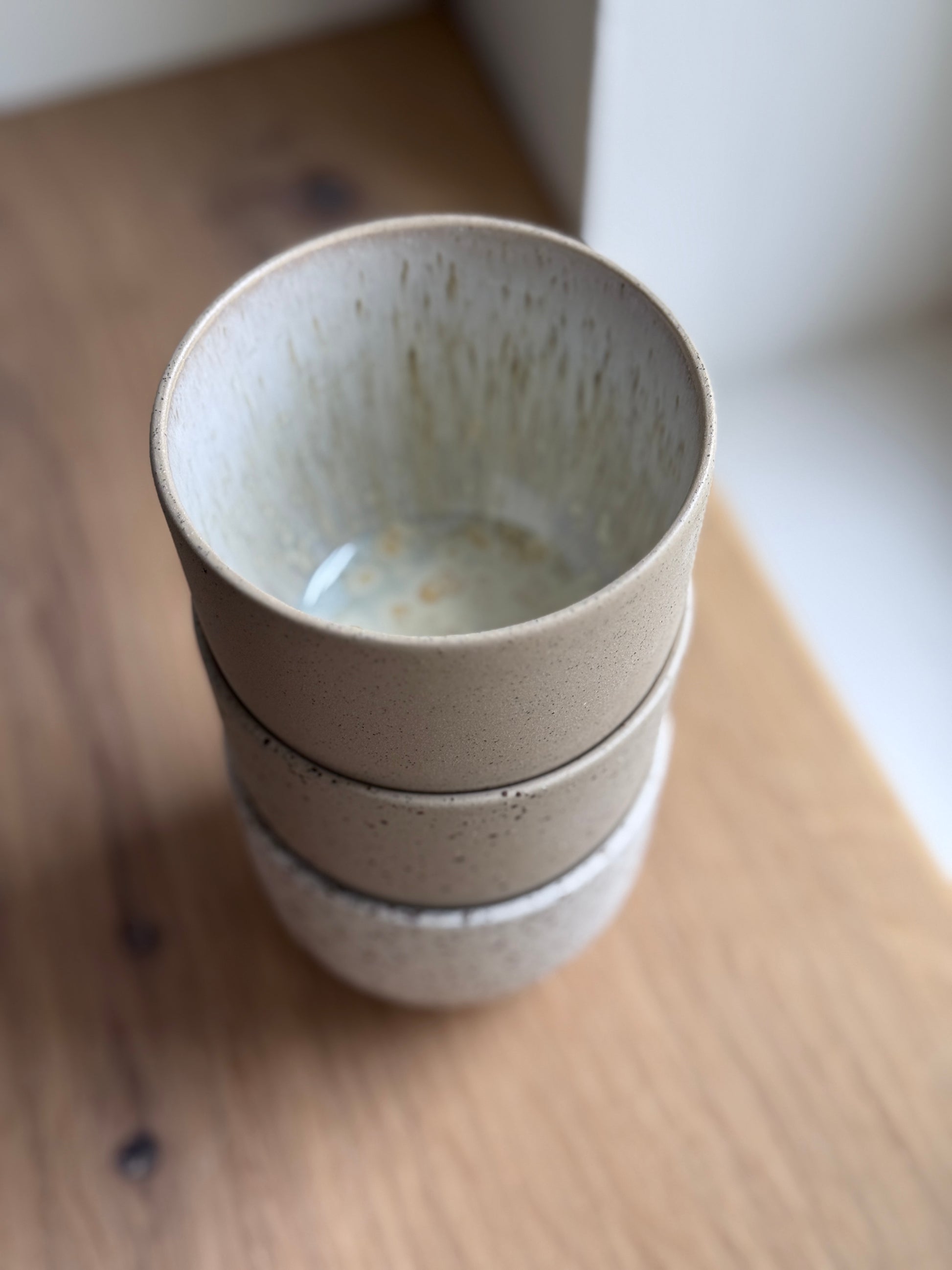 The cup is carefully slip casted in light Brown stoneware. After the first firing it is glazed on the inside with a crystal glaze and then sand washed on the outside, which makes it smooth and soft to the touch. These cups are also very well suited as dishes for tapas dishes and many other uses.