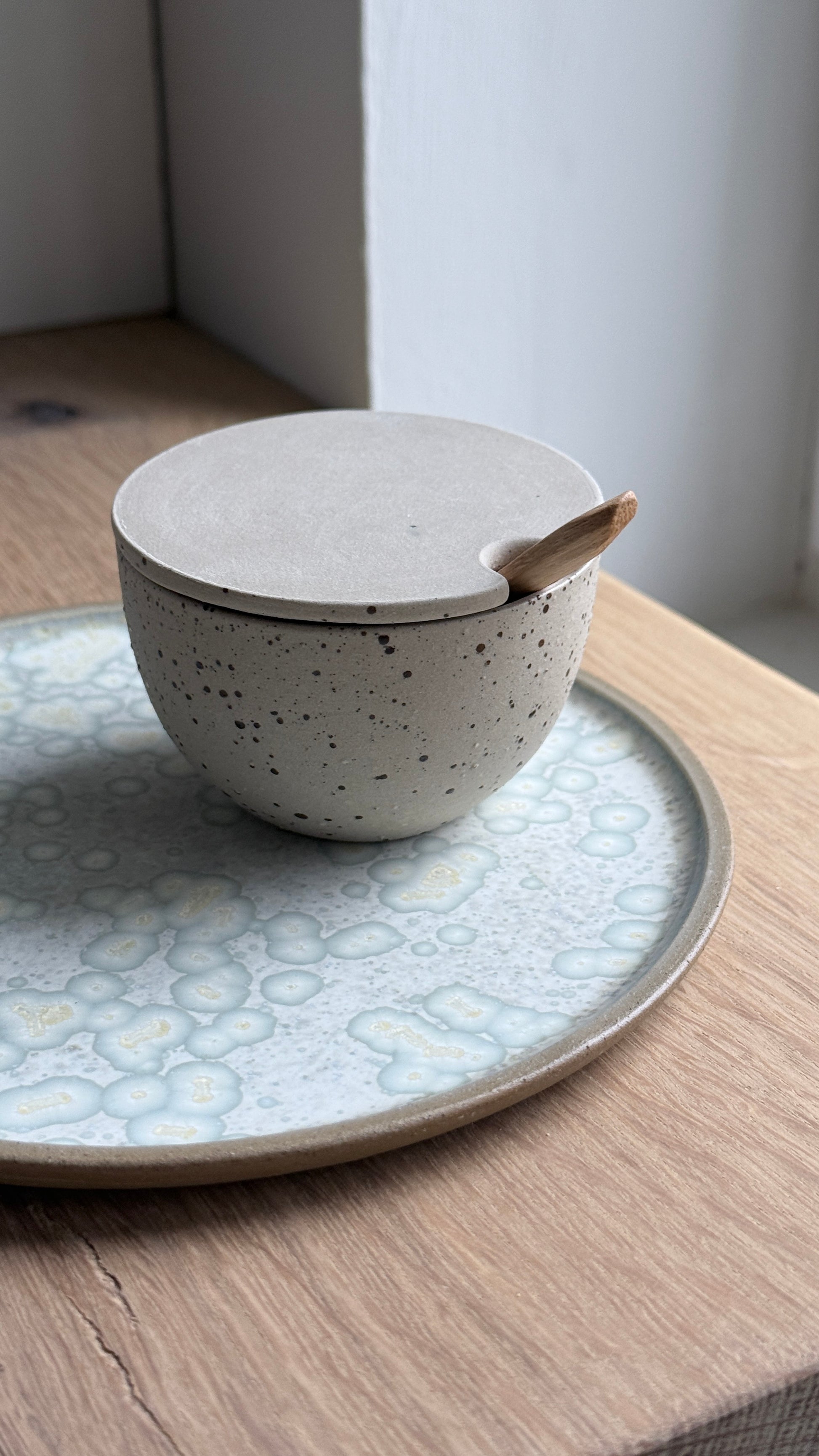 The plate is carefully slip casted in stoneware with grey iron specks. After the first firing it is glazed on the inside with a crystal glaze and then sand washed on the outside, which makes it smooth and soft to the touch..