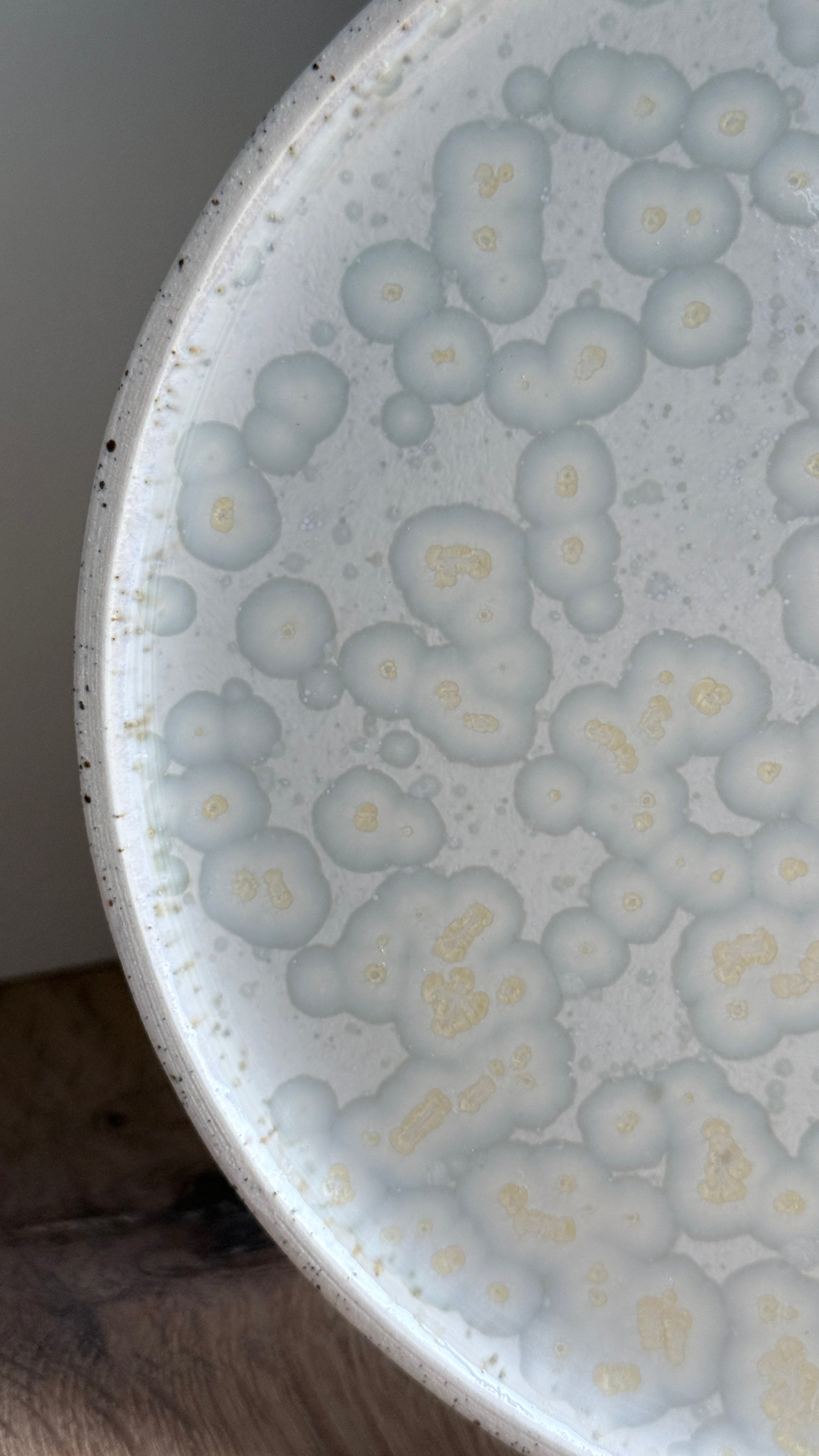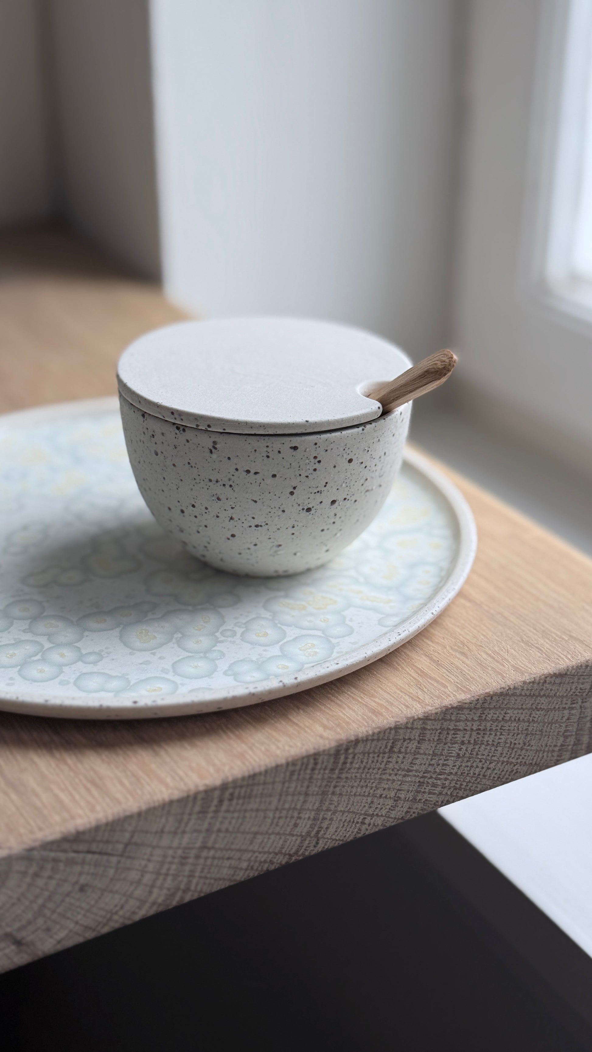The plate is carefully slip casted in stoneware with grey iron specks. After the first firing it is glazed on the inside with a crystal glaze and then sand washed on the outside, which makes it smooth and soft to the touch..
