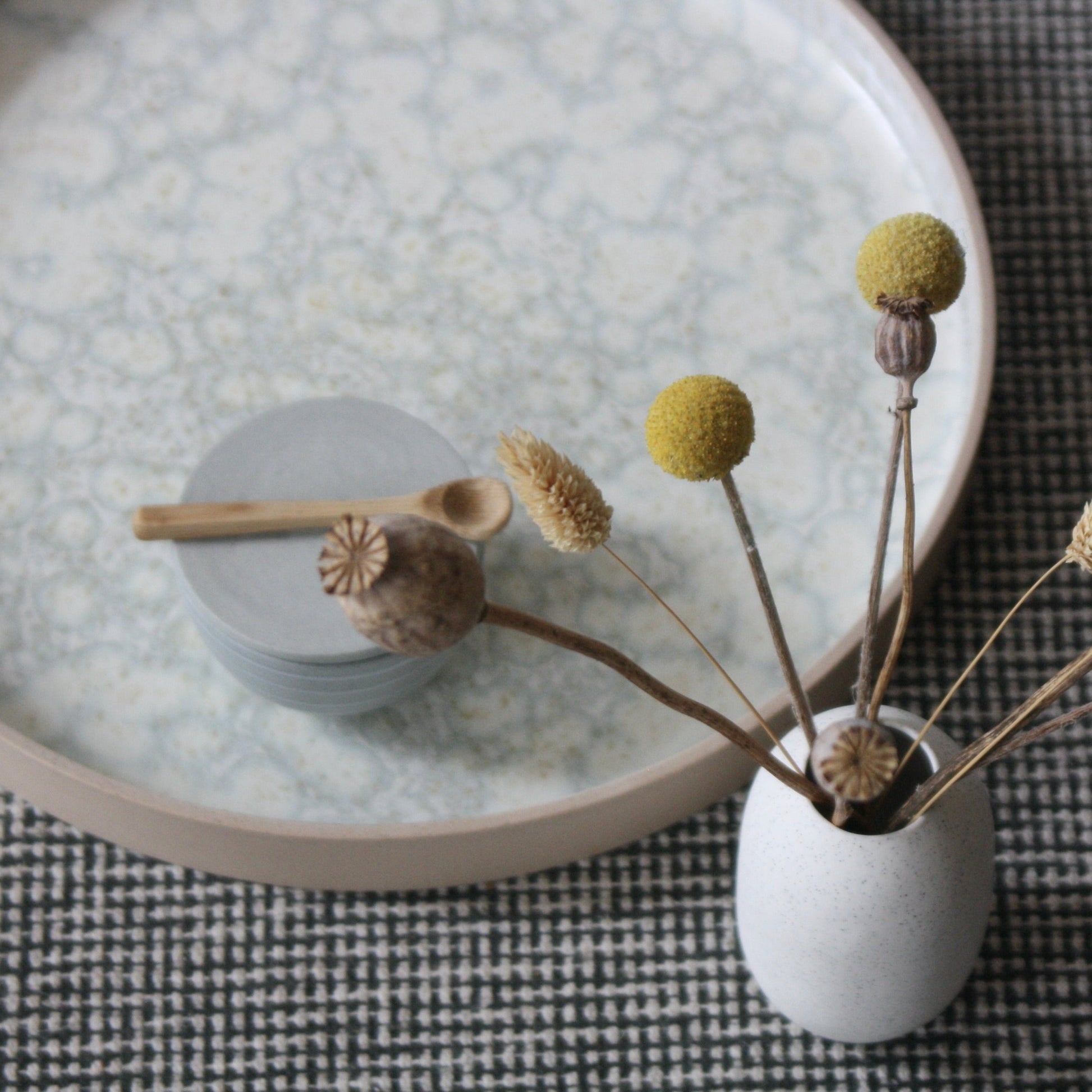 Der er variationer i alle produkter, da de er fremstillet i hånden. Hvert enkelt produkt er støbt, pudset, glaseret, dekoreret og efterfølgende vandslebet i hånden. Produkterne er designet og fremstillet på værkstedet i København og alle dele kan komme i opvaskemaskinen og i microbølgeovnen.