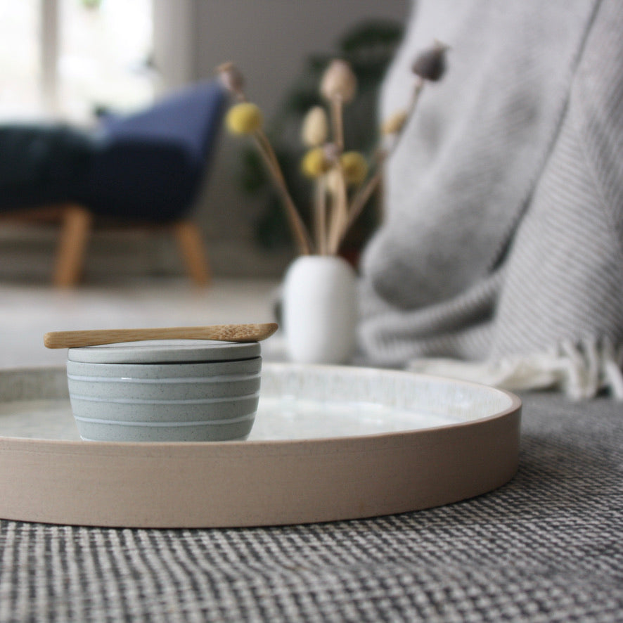 The dish is carefully slip casted in Light Rose stoneware with grey iron specks. After the first firing it is glazed on the inside with a crystal glaze and then sand washed on the outside, which makes it smooth and soft to the touch..