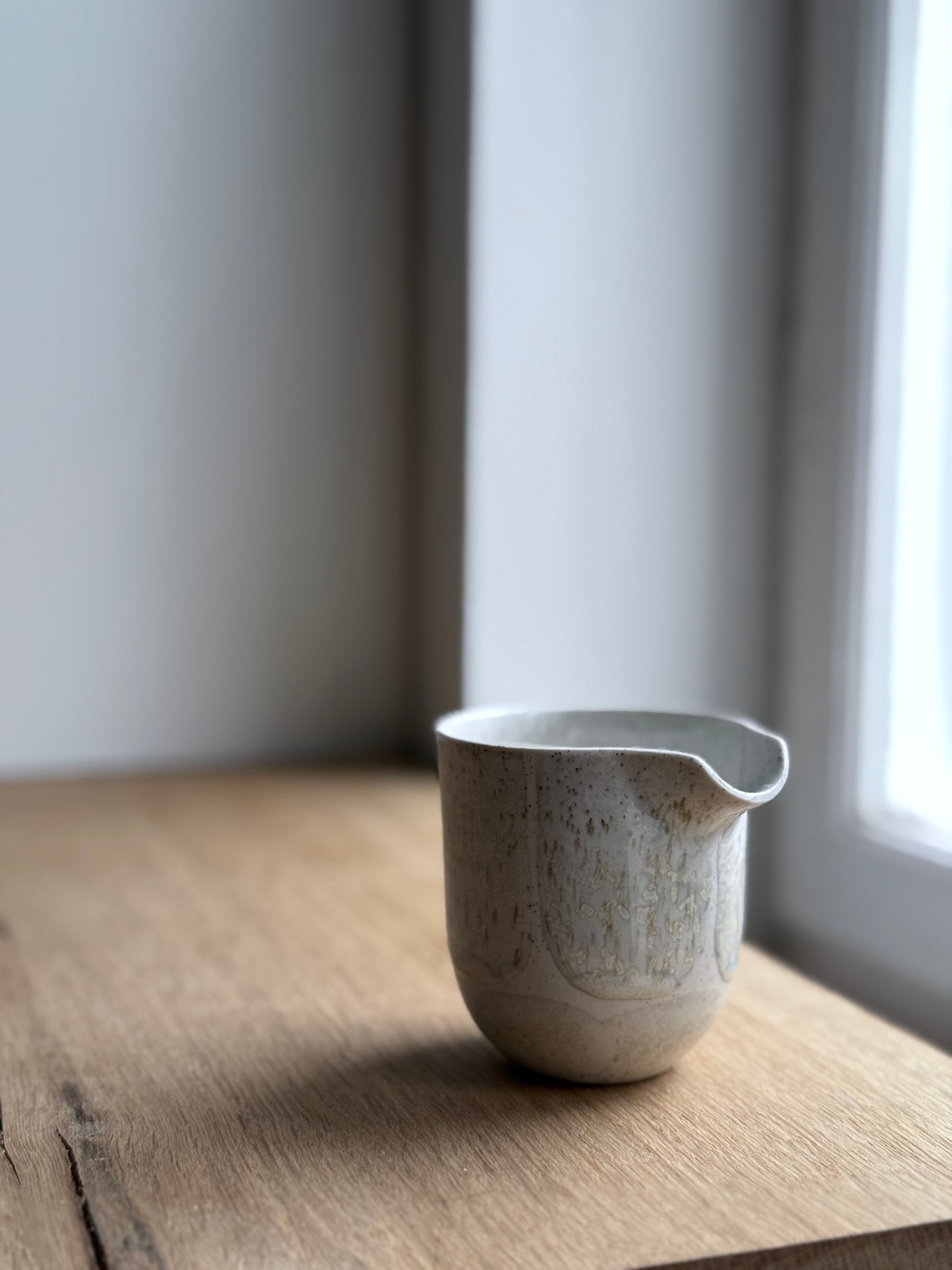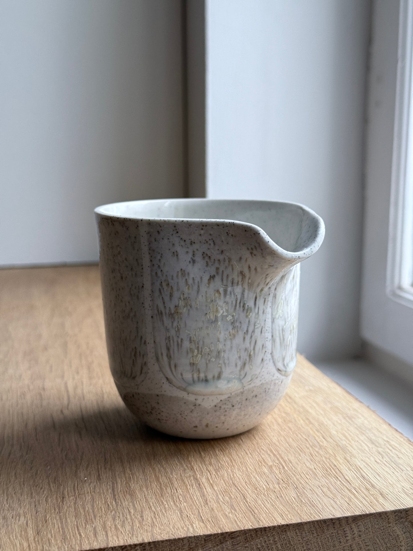 The jug is carefully slip casted in white porcelain with grey iron specks. After the first firing the bowl has been glazed on the inside and then hand painted with a crystal glaze on the outside. The glaze pattern highlights the iron specks. The product has a lovely contrast between the matte porcelain and the glossy glaze.