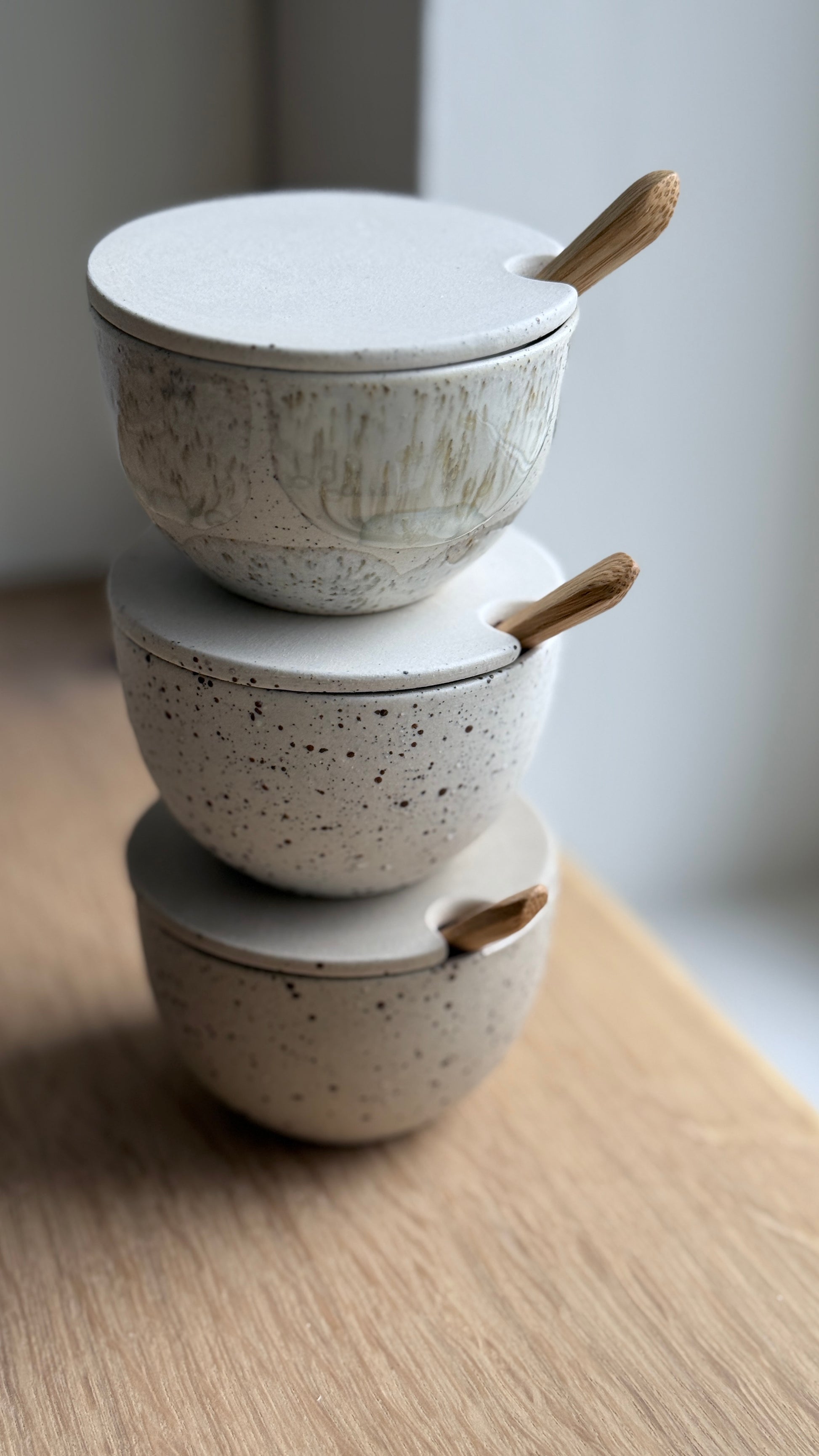 Salt Bowl, w/lid & Spoon, Matt white/ brush